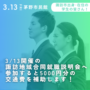 2026.3.13「諏訪地域合同就職説明会(茅野市民館)」参加 ※諏訪市出身・在住の学生に交通費補助のご案内
